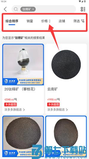 3、在页面搜索如钛精矿,通过综合排序方式筛选合适的货源。