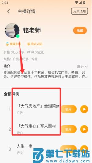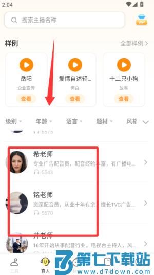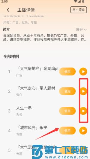 2、在主播列表里随便点一个试试听,有新闻播报、可爱小孩、磁性男声各种类型,挑一个你喜欢的风格,确认后就能用这个声音配音。