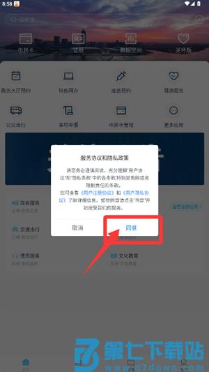 1、启动应用后请阅读服务协议与隐私政策,确认后点击同意按钮。