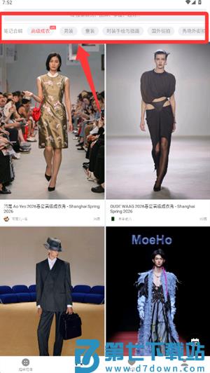 4、通过顶部标签,自由切换笔记合辑或高级成衣等展示分类。