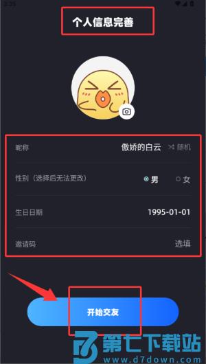 3、完善个人资料填写昵称与性别等信息,开启交友功能。