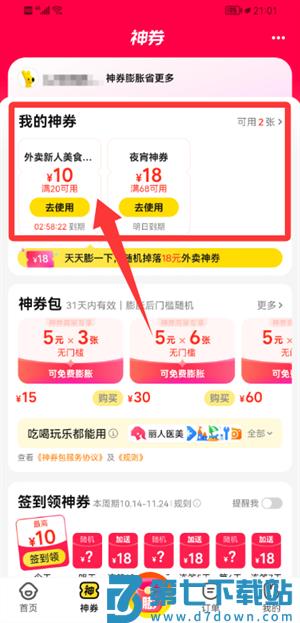 1、进入神券页面查看我的优惠券,选择外卖红包点击去使用。