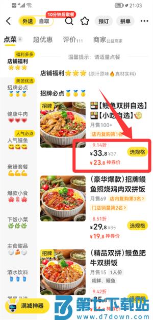 3、进入店铺挑选菜品并确定规格,即可完成优惠券下单操作。