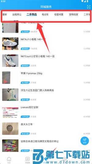 2、登录后访问同城服务,浏览出租转让或二手物品等分类板块。