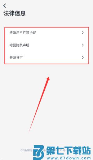4、法律信息页面包含终端用户协议、隐私政策声明及开源许可证等法律文件。