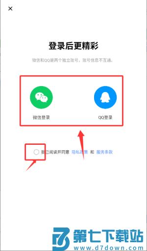 1、勾选同意隐私政策及服务条款,选择微信或QQ登录账号。