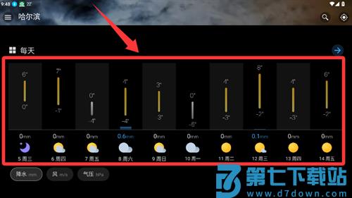 2、进入多日预报板块,浏览每日气温及降水等详细数据。