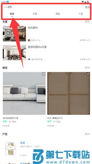 2、登录后进入搜索页,可通过综合或方案等分类筛选装修案例。
