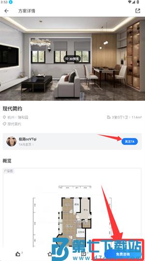 3、在方案详情页可关注设计师或进行免费咨询,获取专业装修建议。