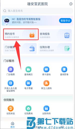3、于主界面选择"预约挂号"功能,进入线上挂号页面。