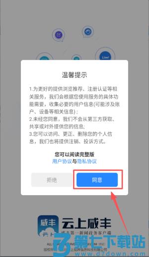1、在隐私协议和用户协议提示中点击"同意",即可进入应用。