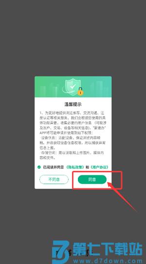 1、启动应用后,在提示框中勾选已阅读并同意选项,并点击确认按钮。