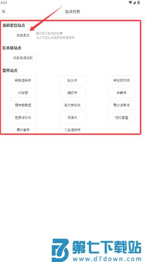 2、进入站点选择页面,可自动定位或手动选择区本级及盟市服务站点。