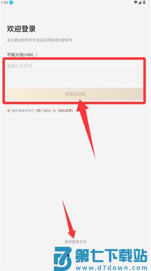1、登录页面输入手机号及验证码,或选用其他方式完成登录。