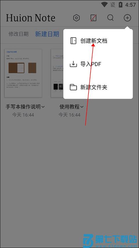 1、进入HuionNote app点击主页右上角的加号,这个时候会跳出一个弹窗,我们点击创建新文档;