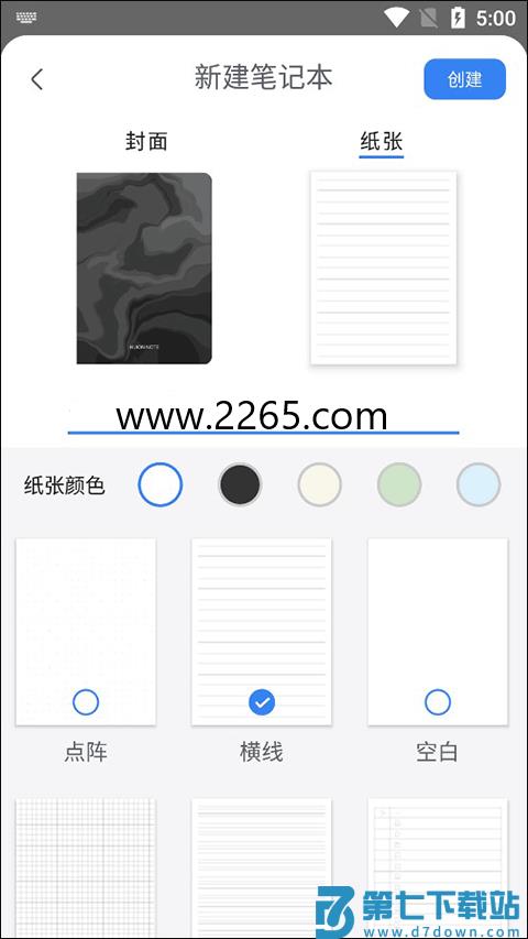 2、进入创建新文档界面,挑选好自己需要的封面和纸张格式,确定好笔记本名称点击创建就创建成功了;