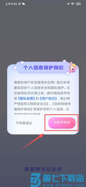 1、在个人信息保护指引提示中点击"同意并继续",即可进入应用。