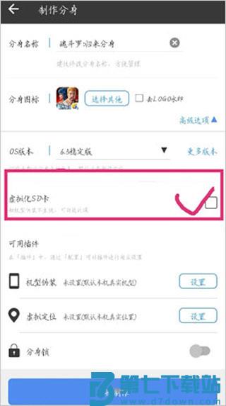 4、输入分身名称、分身图标,选择OS版本,目前可用插件有限,包括机型伪装、虚拟定位、分身锁。