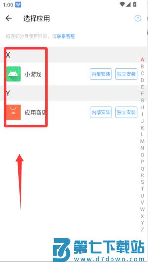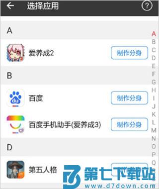 2、点开加号以后会显示你自己手机里的软件,点击字母选择软件制作相应分身。