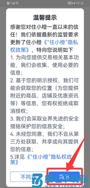 1、在温馨提示窗口点击同意选项,确认隐私权政策条款。