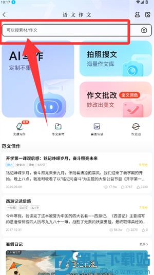 1、在作文页面搜索框输入关键词,查找相关素材与范文。