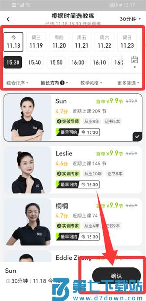 3、根据时间筛选并选定教练,确认后完成课程预约。
