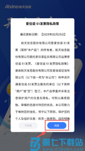 1、在爱信诺51发票软件中点击"同意"隐私政策,进入程序界面。