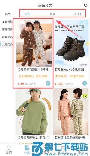 3、使用"综合"排序功能,可查看各类儿童服饰等具体商品。
