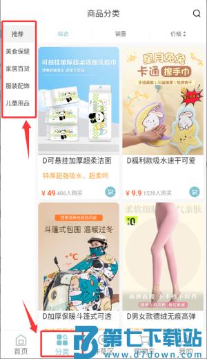 2、进入"分类"栏目选择儿童用品类别,浏览相关商品列表。