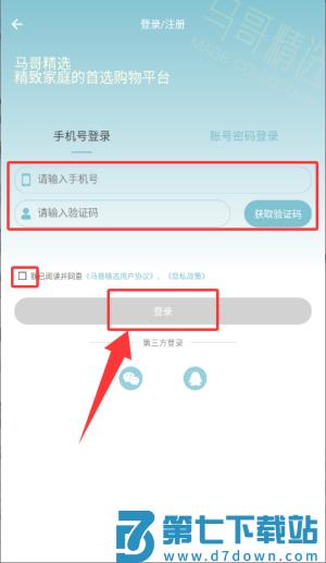 1、在马哥精选登录界面输入手机号及验证码,勾选协议完成登录。