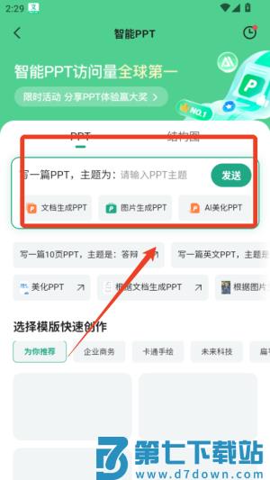 1、下载百度文库APP,登录后点击“智能PPT”。输入主题或关键词,AI自动生成PPT框架,选择模板后调整内容,一键导出为PPTX格式。