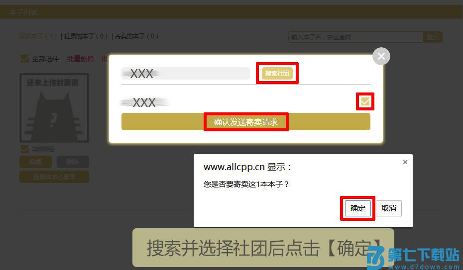 第四步。输入社团名或社团ID进行搜索并勾选该社团,【确认发送寄卖请求】后在弹出框内选择【确定】。到这边 作者的部分就结束了 接下来就需要社团创建者确认寄卖即可。