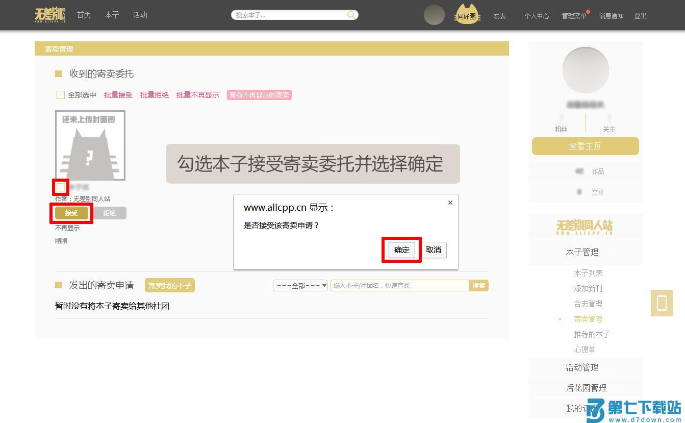 第五步。也是最后一步。接受寄卖的社团可以到【寄卖管理】-【收到的寄卖委托】中勾选本子并确认。这样,社团主催就可以将您的本子关联至展会,本子页面内也会显示相关参展信息了。