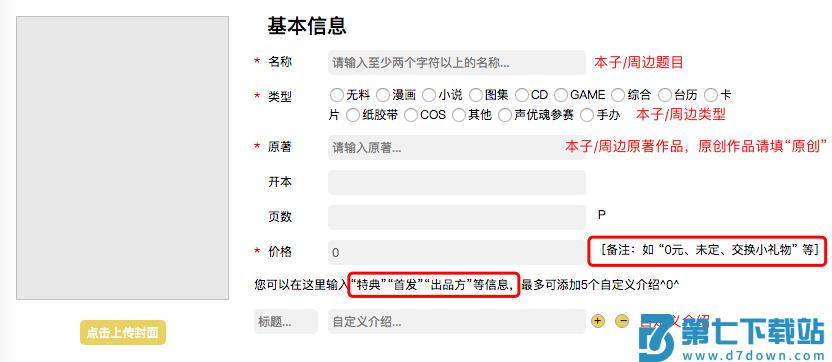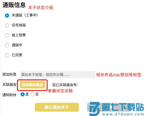 第二步。完善本子信息。到这里,如果您是社团的创建者,即可到【活动管理】-【可申摊活动】中勾选本子进行参展。如果您并非社团的创建者,请通过【寄卖】系统,寄卖到您参展的【社团】进行关联,具体方法如下。