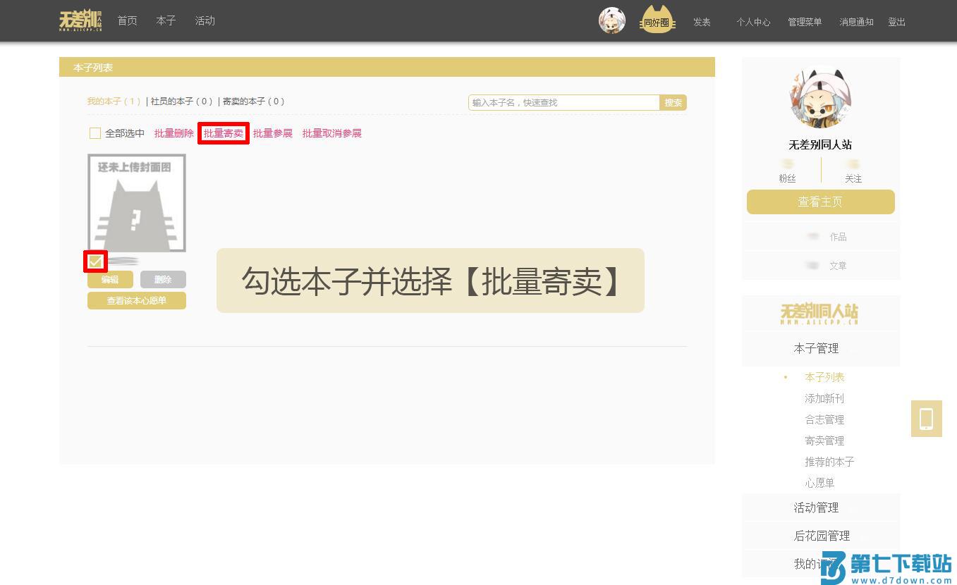 第三步。勾选您需要参展的本子选择【批量寄卖】。