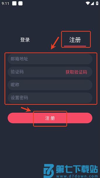 2.进入【注册】,输入QQ邮箱--填写获取的邮箱验证码--设置昵称--设置密码后点击“注册”(昵称不能出现数字)