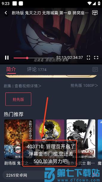 1.可以看到动漫共和国共和国的一些基础功能有金币门槛,如发送弹幕屏幕以及下载功能