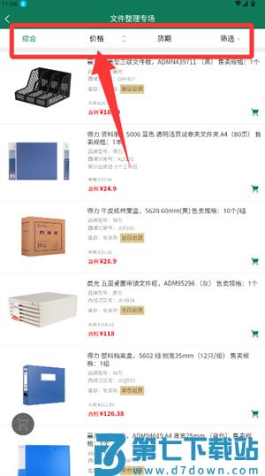 2、在文件整理卖场,可按价格与货期筛选合适商品。