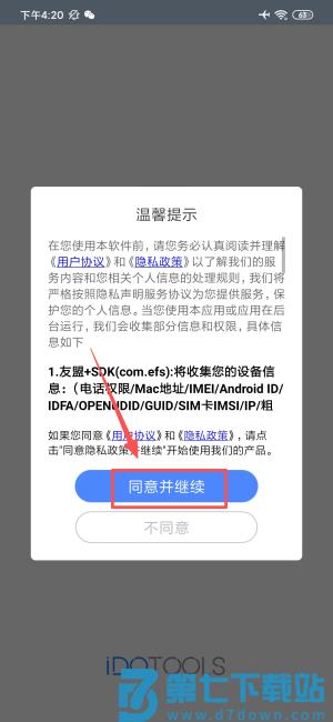 1、于软件协议界面点击“同意并继续”,开启应用程序。
