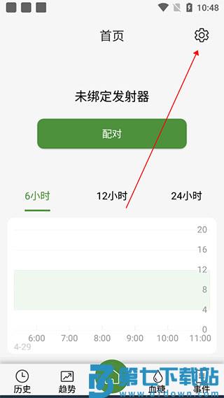 在首页的右上角,点击设置小图标进入设置页面,在设置页面点击“发射器”进入发射器绑定页面,输入持续葡萄糖监测系统设备上的SN码或扫描包装上的二维码绑定设备。