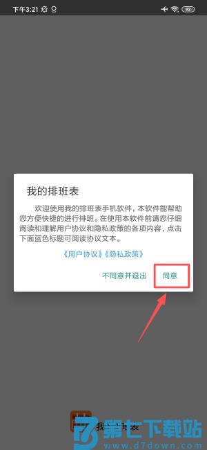 1、在"我的排班表"软件中点击"同意"用户协议,进入程序界面。