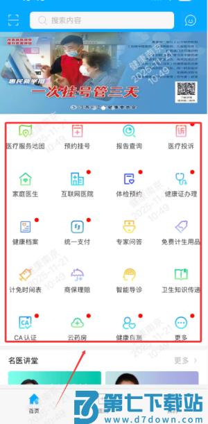 3、首页提供医疗机构分布查询、门诊预约、检验报告获取及家庭医生签约服务。