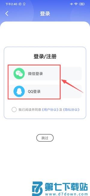 1、于登录页选用微信或QQ登录方式,勾选协议完成验证。