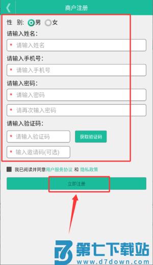 3、填写性别与姓名等信息并勾选协议,点击完成商户注册。