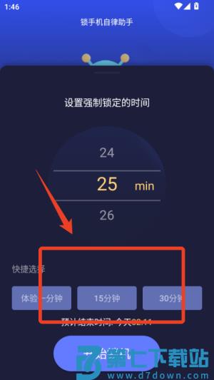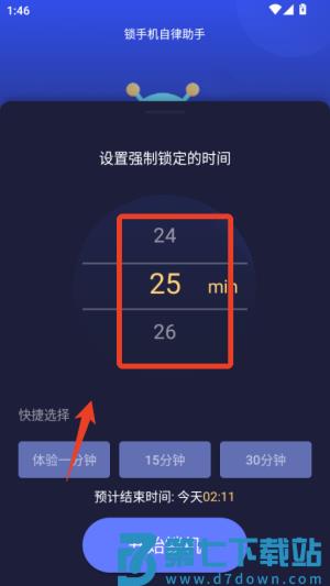 1、下载并打开锁手机自律助手,在主界面设置需要锁定的目标时长,例如专注工作45分钟。