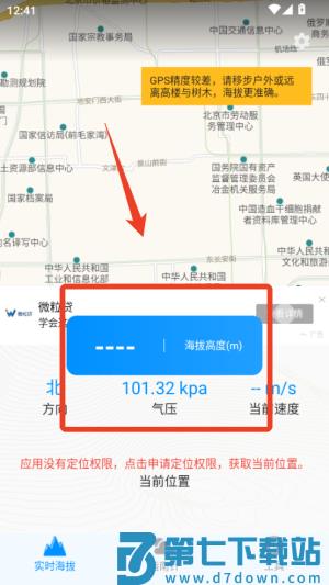 2、在主界面点击海拔测量功能,稍等几秒即可看到当前实时海拔高度。
