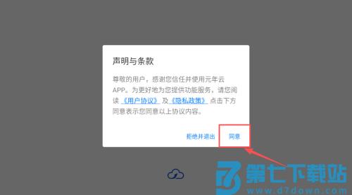 1、在元年云APP中点击"同意"声明条款,进入程序界面。