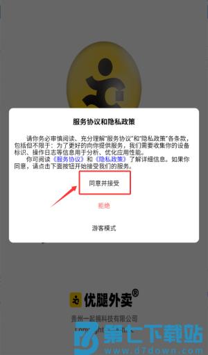 1、在优腿外卖APP中点击"同意并接受"服务协议,进入程序界面。