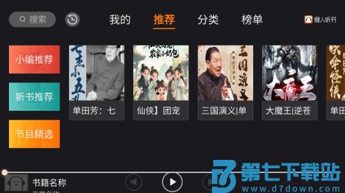1、打开软件后先点击首页推荐板块,系统会根据热门程度自动展示精选书籍,你可以直接点击封面开始播放,也可以下滑查看更多分类内容。