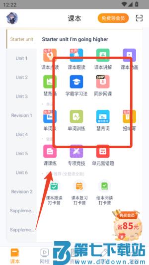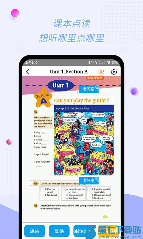 2)课本学习:同步校内外课本,沉浸式体验课本,支持课本点读、连读、复读、跟读测评,还有课本翻译、课后小练习看答案、课本听力文稿等;